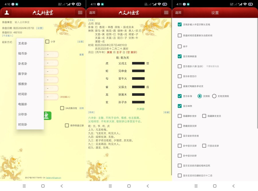 (1)支持阴阳爻排盘、钱币排盘、卦名排盘、数字起卦、日期排盘和电脑起卦