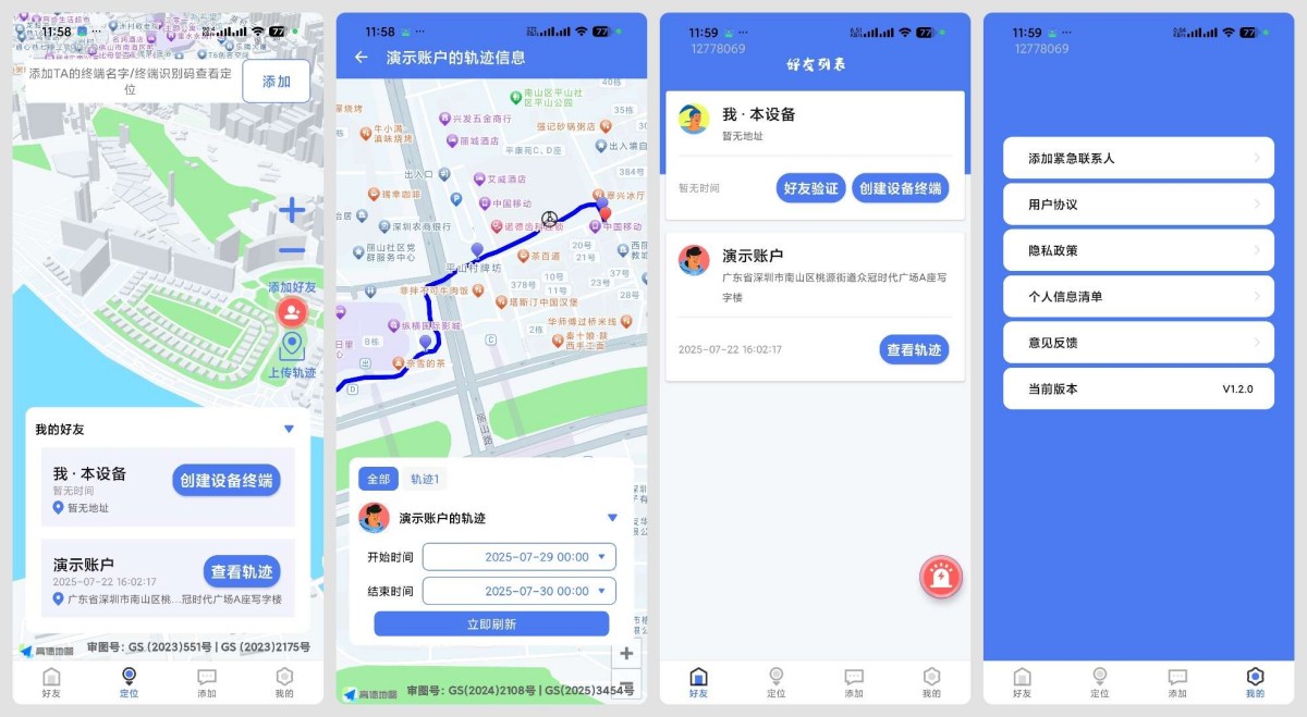 一款位相互分享的科技软件,在你的授权之后进行一定频率和规律位置记录,可以按照实时位置和轨迹进行查看。软件可以通过手机号查找对方账号(需对方安装并通过手机号登录),在对方授权后进行实时位置查看和轨迹查看,是亲人、情侣之间关爱的好帮手。当您获得定位授权后,即可查询对方的实时定位位置,默认刷新时间为10秒,您可以自行调整频率,并且提供对方用户离线和在线状态展示。